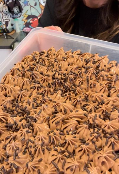 Une fois que le dessus du gâteau est recouvert d'étoiles, dispersez des petits bonbons de chocolat dessus, couvrez et congelez.