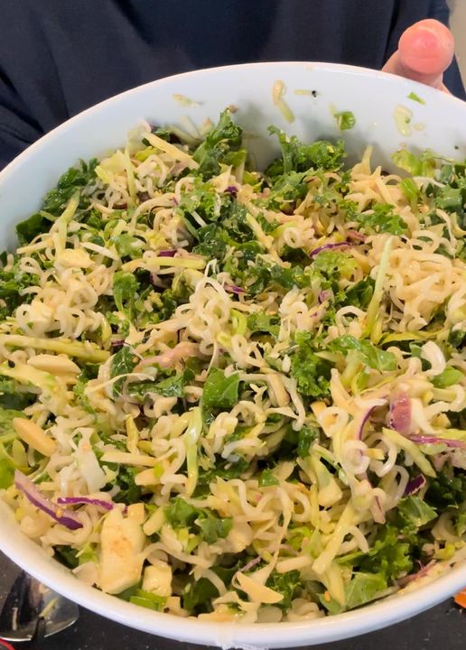 Mélange l’huile avec le sucre et les sachets de bouillon et ajoute le mélange dans la salade!