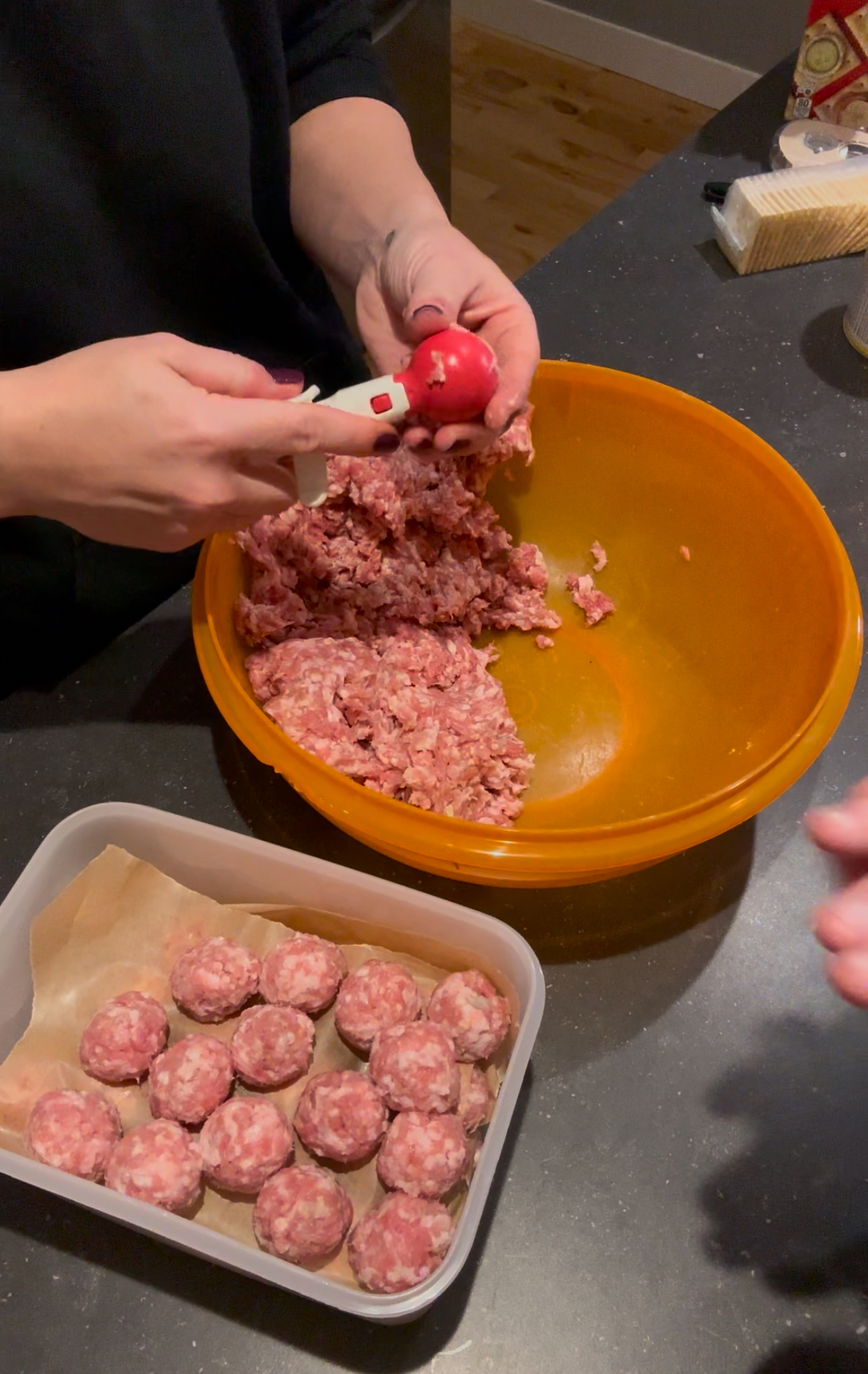 Afin de pouvoir utiliser le nombre voulu de boulettes sans les décongeler au moment voulu, ne pas trop coller les boulettes et mettre un papier parchemin entre les étages.